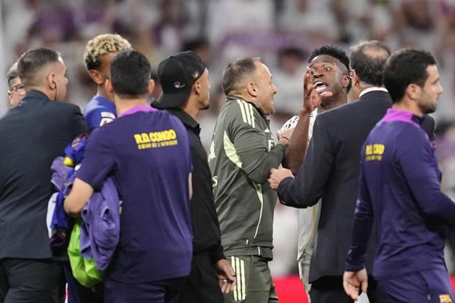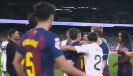 而作为胜利一方的皇马球员也毫不示弱地与他正面硬刚。眼见有队友撑腰,亚马尔索性隔着人群,连续向几个对手叫嚣"有种出去解决"。